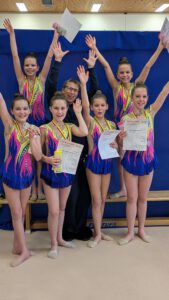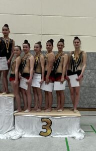 Nina, Leonie, Michelle, Paulina, Melena und Mia starteten in der nächsthöheren Altersklasse 12-15. Drei Gruppen waren hier am Start. Nachdem der erste Durchgang einige Fehler hatte, kämpften sich die Mädchen mit einem starken 2. Durchgang nochmals heran. Leider klappte die Aufholjagd nicht und die Mädchen belegten nach der TBG Neulussheim und dem TV Bretten den 3. Platz. Damit schafften sie leider nicht die Qualifikation für die Dt. Meisterschaft, aber die Mädchen starten alle nochmals beim Landesturnfest in Konstanz.