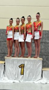 Auch beim Landesturnfest dabei sein wird die Gruppe AK 16+. Lia, Ina, Jenny, Elisa und Emma wurden Badischer Meisterinnen mit Ihrer Kür mit 2 Bällen und 3 Reifen. Die neue Choreografie zu Musiken von Queen sowie die zwei Handgeräte fordern alles von den Mädchen ab. Die kleinen und großen Fehler von den Gaumeisterschaften konnten sie am vergangenen Samstag zwar minimieren, trotzdem ist noch Platz nach oben. Bis zu den Dt. Meisterschaften Ende Juni sollte aber die Stabilität da sein und man darf gespannt sein, wie sich die Gruppe bei den Dt. Meisterschaften in Nürnberg präsentieren wird.